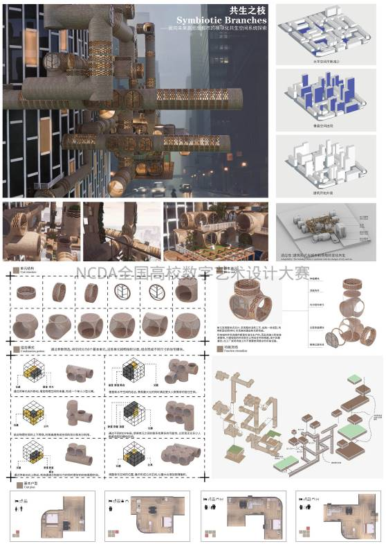 本次竞赛中获得全国一等奖的作品为《共生之枝--高密度都市模块化共生空间探索》(作者:赖国城,指导老师:叶鑫、龚曲艺)。该设计提出一种适用于未来高密度城市环境的模块化“共生枝干”体系,以树状结构为灵感,构建由标准化圆筒模块组成的三维空间网络。模块可通过无人机吊装快速拼接,形成集居住、种植、共享等功能于一体的“建筑外挂共生体”,旨在不破坏既有城市结构的前提下,为未来城市提供生态、可持续、可迁移的立体居住新模式,回应高密度城市化下的人居弹性需求。