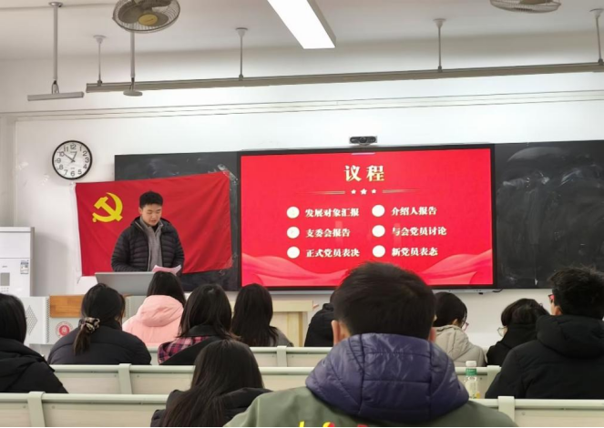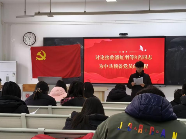 活动伊始,李斗同志宣布了会议流程和主题,根据党支部发展党员工作计划,得到上级党委的预审同意,讨论接收潘虹羽、代坤航、张思诺、李圳冬、刘东森、马海马强、陈柏烨、阿尔小虎等8名同志为中共预备党员以及讨论预备党员亢永祥、刘可、濮欣然、张尧等4名同志的转正问题。