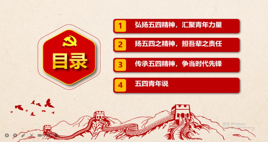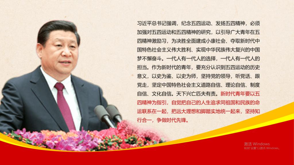本次会议第一部分讲到了五四青年节的由来已经中国近代史上的杰出青年的英勇事迹。第二部分则主要讲述了五四青年节的意义是为了纪念一场爱国运动上的英雄们。以及眼下,东方巨龙正以活力四射的姿态腾跃于世界之巅。中国人民拥有了前所未有的道路自信、理论自信、制度自信、文化自信,中华民族伟大复兴展现出前所未有的光明前景!第三部分习近平总书记强调新时代青年要以五四精神为指引,自觉把自己的人生追求同祖国和民族的命运联系在一起,把远大理想和脚踏实地统一起来,坚持知行合一,争做时代先锋。最后一部分则讲述了当代青年们对当代英雄们事迹的一个评价以及当代青年如何弘扬五四精神给出的解答。