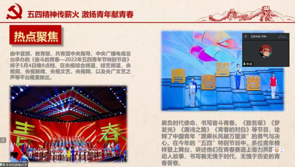 本次会议聚焦于《奋斗的青春—2022年五四青年节特别节目》,结合习近平总书记代表党中央,向全国各族青年致以节日的祝贺,向中国人民大学全体师生员工、向全国广大教育工作者和青年工作者致以诚挚的问候。将本次大会主题分为四部分进行讲解:弘扬五四精神,汇聚青年力量;扬五四之精神,担吾辈之责任;传承五四精神,争当时代先锋;五四青年说。