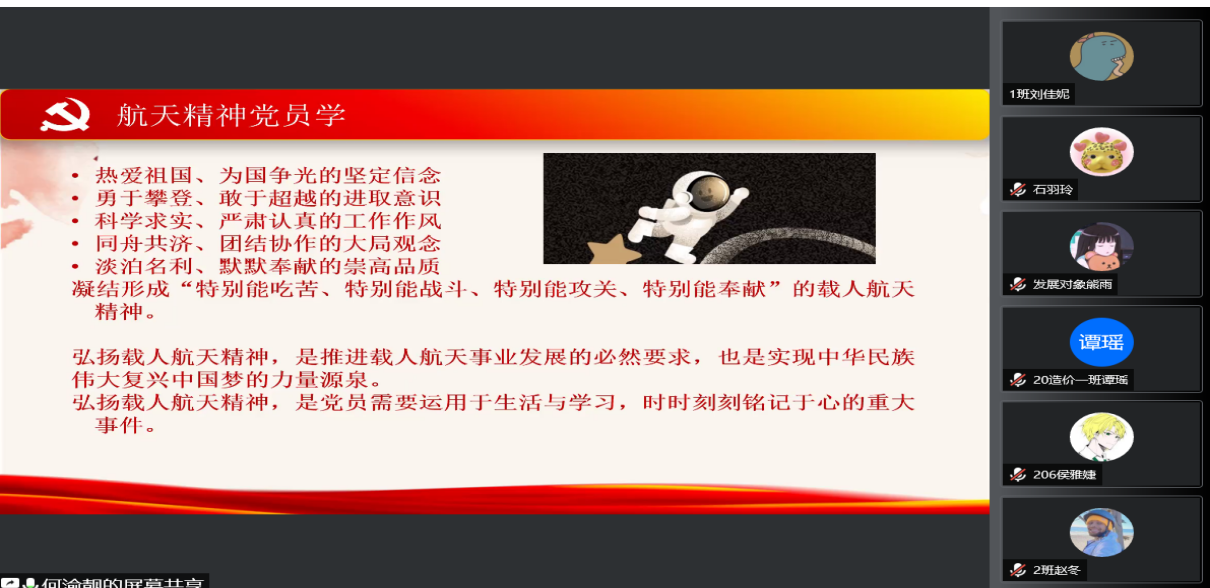 此次会议中还向大家分享了“神舟”系列的飞天事迹,讲述了中华民族如何将“摘星揽月上九天”从梦想变为现实,与各位支部成员讨论了中国航天事业发展的意义。尤其对如何成为一名航天员的课程以及长期微重力作用下所产生的后遗症作了详细介绍,中国载人航天工程的飞速发展离不开航天工作者们的伟大奉献和艰苦卓绝的奋斗历程,凝结形成了“特别能吃苦、特别能战斗、特别能攻关、特别能奉献”的载人航天精神。