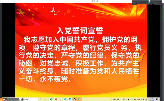 会议后半段,几位同志共同宣誓入党誓词,铿锵有力的话语展示出了其入党的决心与为人民服务的勇气。