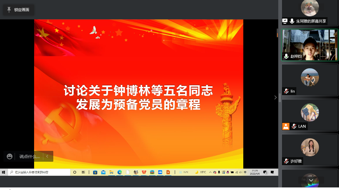 学生第一党支部在线上开展了支部党员大会。大会讨论了关于钟博林等5名同志发展为预备党员的章程。朱珂雅同志为本次支部党员大会的主持人。学生第一党支部书记潘学飞老师参加了本次支部党员大会。