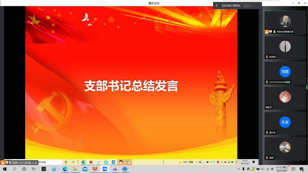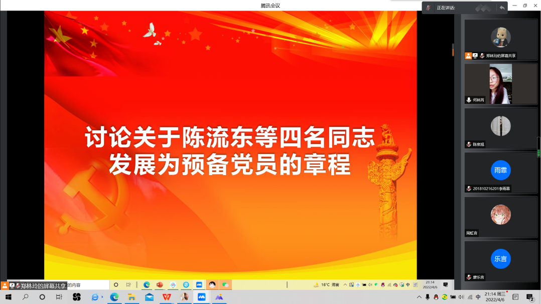 学生第二党支部于线上召开讨论关于陈流东等四名同志发展为预备党员的章程的党员大会。会议由郑林玲同志主持。学生第二党支部书记舒愉棉老师参加了本次党员大会。