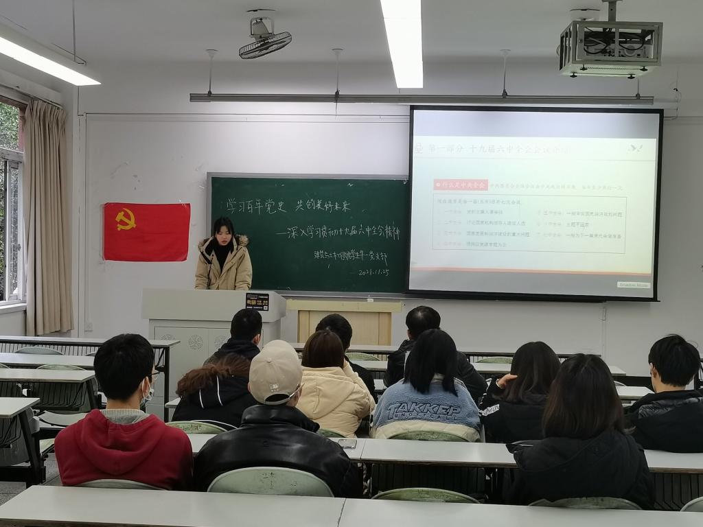 (图为潘姝颖同志介绍党的十九届六中全会内容)