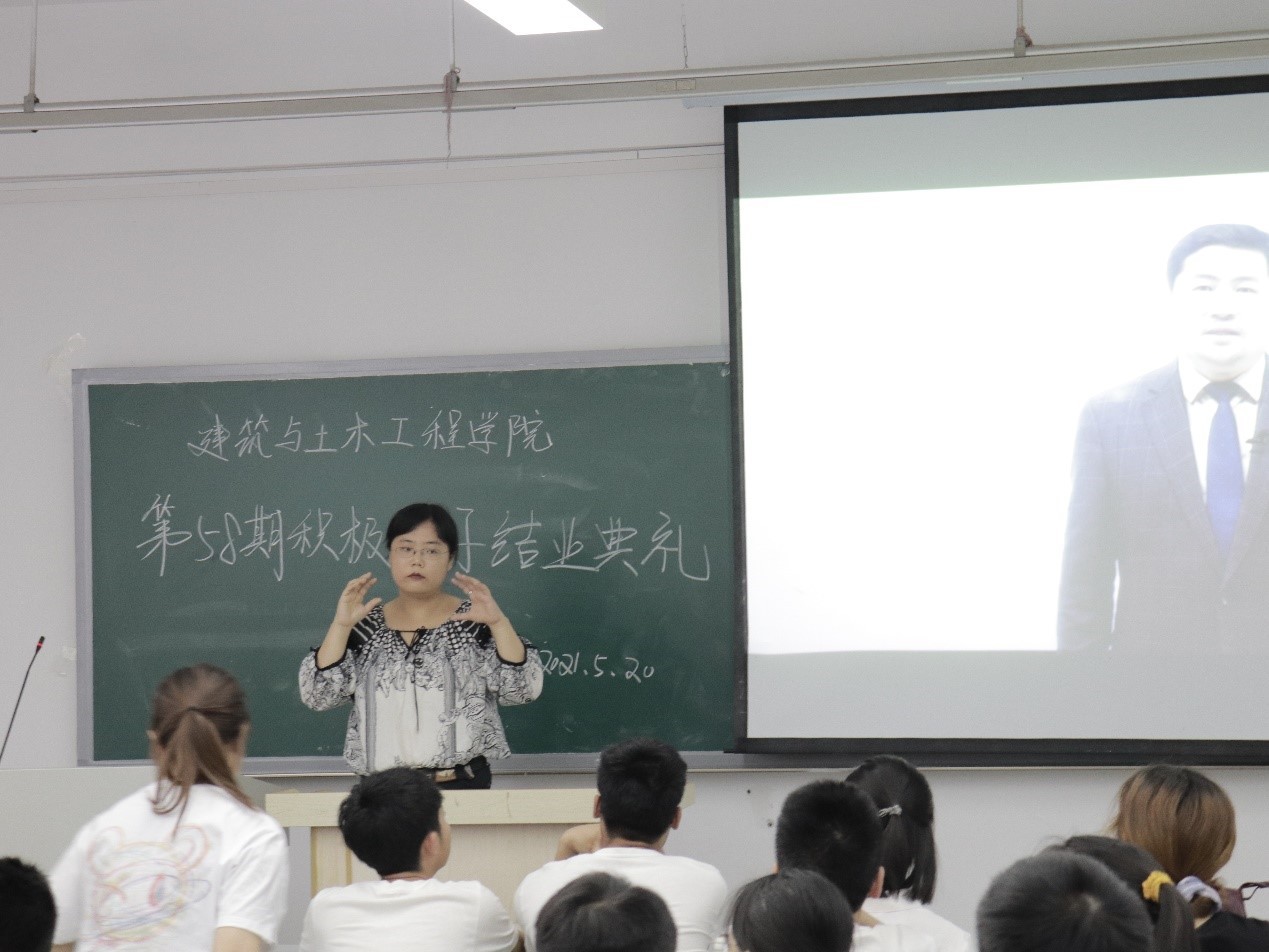 本次结业典礼第一项是党校培训班班主任舒愉棉老师致辞。舒愉棉老师首先对全体学员成功结业表示了祝贺,并告诫全体学员成为入党积极分子后,就应该以党员的标准在政治上、思想上、工作上等多个方面来要求自己,并积极地为人民服务。最后,舒愉棉老师希望大家对党的理论知识学习要持之以恒、常抓不懈;希望大家通过此次培训,把学习的成果转化为实际的行动,希望大家多学党规党纪党史,早日加入党组织。
