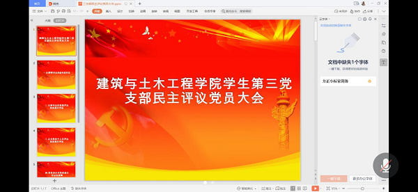 学生第三党支部民主评议会通过线上会议顺利召开。此次会议由胡阳烊同志主持,有学生第三党支部书记孙也椒老师及学生党员出席。学生第三党支部现共有党员27人(正式党员11人含支部书记),到会党员27人,出席会议的有正式党员11人(含支部书记)。