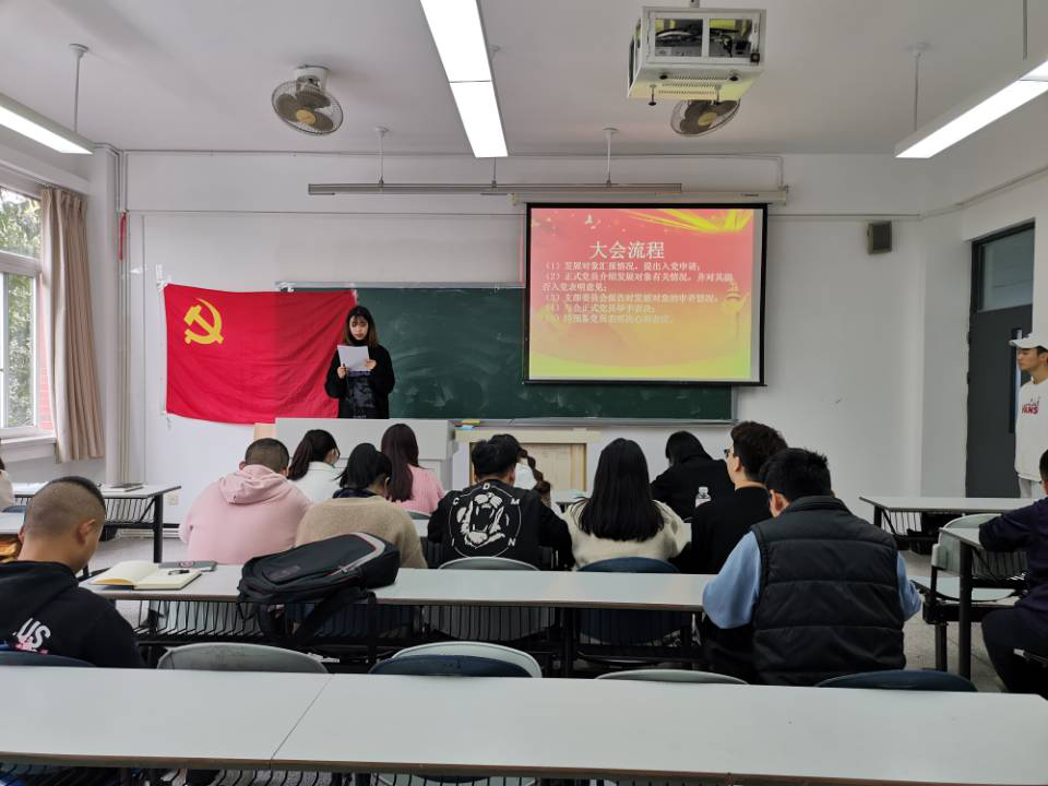 王书田等七位发展对象逐一宣读《入党申请书》,向党组织汇报自身对党的认识、入党动机、个人经历以及在校表现等,随后入党介绍人向大会介绍其主要政治思想、学习、工作生活等情况,朱慧琳同志向大会报告其现实表现的考察情况以及综合政治审查情况,发展对象回避后,与会正式党员对发展对象是否符合党员条件发表了意见,并由杜冰洋同志宣读支部党员大会决议。