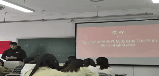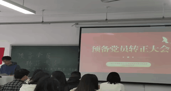 然后,庞旭淋等10位中共预备党员逐一宣读了《转正申请书》,向党组织说明入党预备期已满,并对自己预备期中在工作、学习、政治思想等方面做出了全面的总结,指出了自身的不足和改正情况。随后由其入党介绍人向党组织汇报介绍其在一年预备期中的表现及考察情况并提出同意其按期转为中共正式党员的意见,然后预备党员回避,正式党员对其是否能够按期转为中共正式党员进行表决。最后,由杨昱嘉同志宣读支部大会最终决议,庞旭淋等10位预备党员同志全票通过,按期转为中共正式党员。