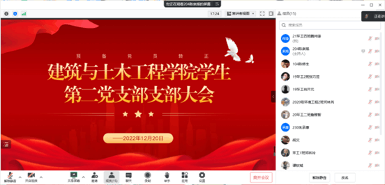 学生第二党支部在线上召开了讨论关于张巧芸等五名同志转为中共正式党员的党员大会。会议由陈泉旭同志主持,党支部书记舒愉棉同志出席会议。学生第二党支部成员及发展对象参加会议,会议实到20人,其中正式党员3人,正式党员全部到会,本次会议有效。
