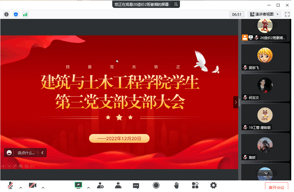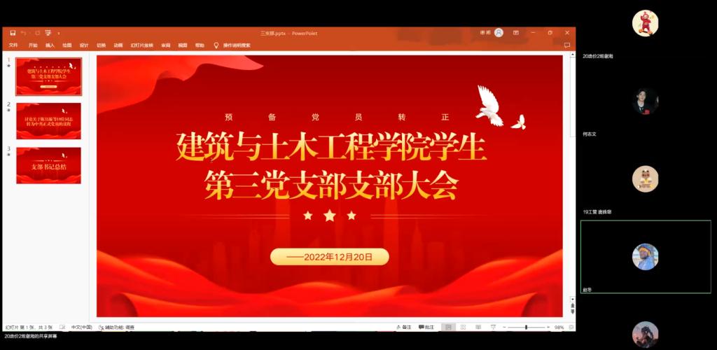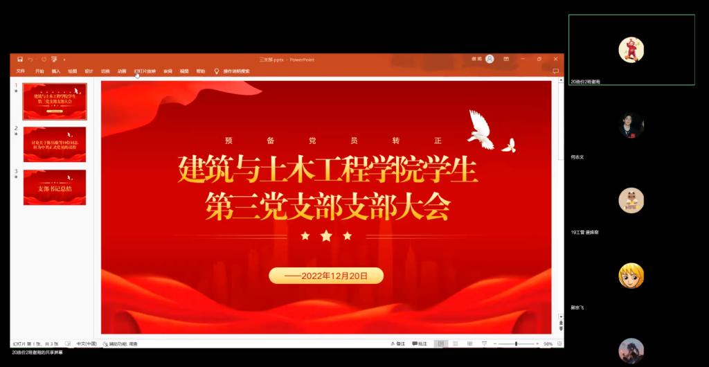 学生第三党支部通过腾讯会议召开了讨论预备党员陈钰璇等10位同志的转正问题。会议由谢湘同志主持。本次会议应到正式党员6名、预备党员28名,实到会正式党员5名、预备党员28名,有表决权的到会人数超过应到会有表决权人数的半数,符合规定人数,此次大会有效。