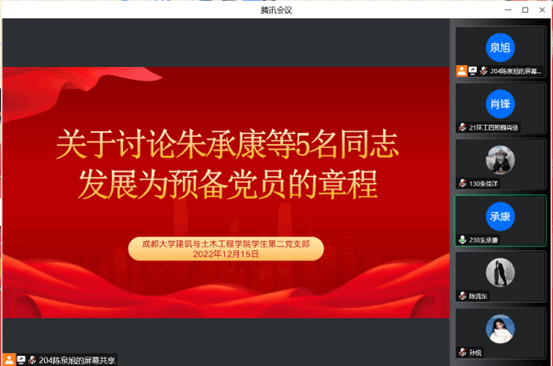 首先,该五名同志分别向党组织汇报自己对党的认识和入党动机,以及自身的政治信念,成长经历等情况,联系生活与学习实际情况,分析并总结自身优缺点,最后表达自己对待入党的坚决态度和决心。每名同志汇报完毕后,由该名同志的入党介绍人向与会党员介绍其政治思想等方面的表现情况。党员大会党员听取相应情况后,就是否同意其发展为预备党员进行无记名投票表决并发表相应意见。最后,由陈泉旭同志宣读支部大会最终决议,大会通过朱承康等五名同志发展为预备党员。随后,五名发展对象发表个人感受,表明了以党员身份严格要求自己、为人民服务的决心和态度。