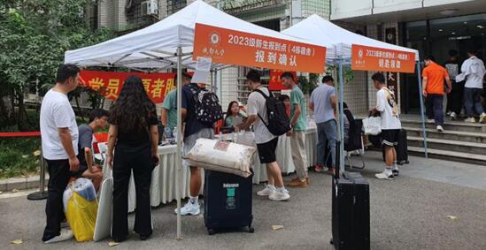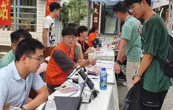 迎接地点设在学生四舍门口,党员志愿者在此值班,即使酷暑难耐,但党员志愿者们顶着烈日为新同学服务,帮助新生入学。