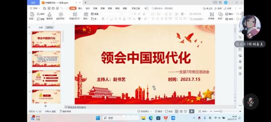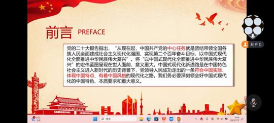 学生第一党支部于线上举行了党日活动会,会议主题为“领会中国式现代化”。本次学习会应到15人,实到14人,其中正式党员应到7人,实到6人,本次会议主持人为赵书艺同志。