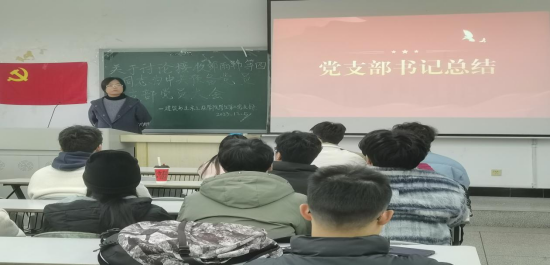 会议最后一项,学生第二党支部书记舒愉棉同志进行总结。舒愉棉同志首先对本次被吸收为预备党员的四名同志表示祝贺,并寄语全体与会党员同志们要“不忘初心”,被吸收为预备党员的这一刻是神圣的、是一个对之前历程的结果,但绝不意味着结束,它代表着一个新的起点。希望党员同志们要更加严格要求自己,努力改正现有不足,坚定初心,定期向党组织汇报思想、学习、生活等方面的情况,不辜负党组织的信任与期待。