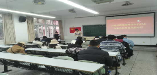 学生第二党支部在5120教室召开了关于讨论邹雨韩等四名同志发展为预备党员的党员大会。会议由漆湘同志主持,学生第二党支部成员及发展对象参加会议,学生第二党支部书记舒愉棉同志出席会议。会议应到19人,实到19人,正式党员全部到场,超过应到会有表决权人数的半数,本次会议有效。