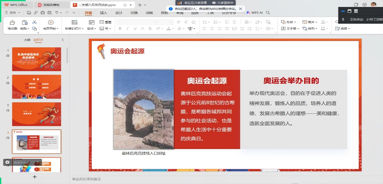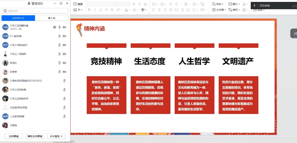 会议伊始,魏肖锋同志介绍了今天的主题。以奥运会的起源及举办的目的为出发点进入了会议第一部分-奥运文化,他深刻介绍了奥运会重要联络作用,这里不仅有体育竞技,更有不同文化的交融。听到这里,吴航玮同志主动分享感想:奥运会强调公平竞争和诚信原则,这与党员坚持的公正法治和道德建设一致,党员同志在工作和生活中要秉持诚信,维护公平正义。