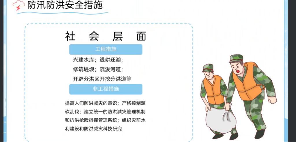 接下来,魏肖锋同志从社会层面与个人层面向与会同志讲解防汛防洪应对措施。增强了同志们对工程及非工程方面防汛防洪措施的了解,提高了同志们对防汛防洪的提前预防以及当灾情来临时个人的应急自救知识的积累。
