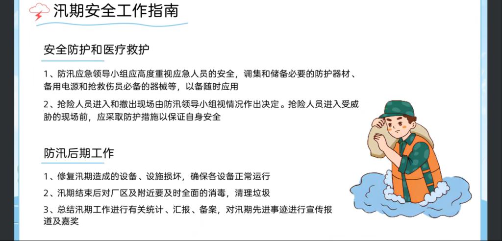 紧接着,魏肖锋同志向与会同志讲解汛期安全工作指南。通过学习,同志们对防汛救灾的基本工作有了更深的认识。汛期安全工作将安全第一、常备不懈、以防为主、全力抢险作为工作方针,以统一指挥、分级负责、层层落实为原则,坚持团结协作,局部利益服从全局利益,切实做到以防为主,防抗结合。