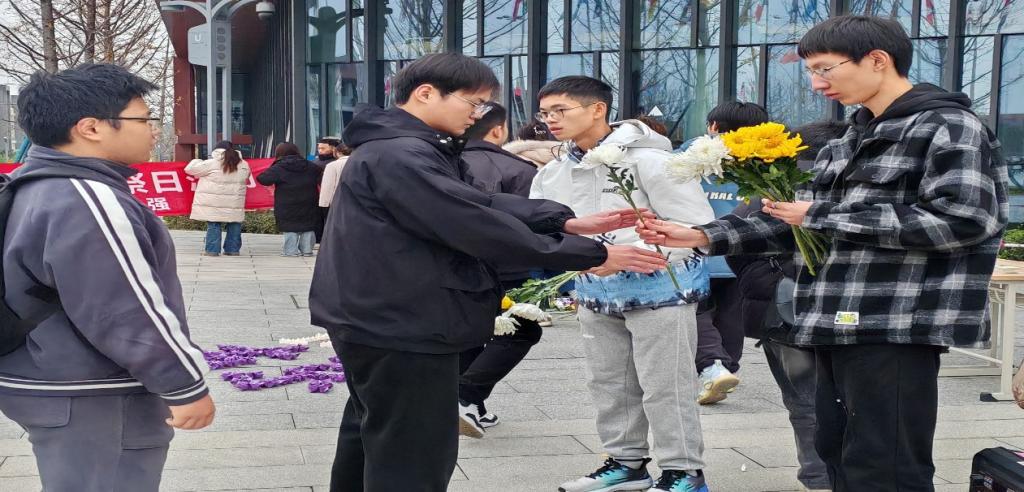 活动第三项,全体人员献花并签名。现场,大家有序地排成一列,等待献花,他们神情凝重,他们轻轻放下鲜花又深深鞠躬。每一朵鲜花,都代表着我们无尽的哀思,仿佛透过这一束束鲜花,能够与那段黑暗的历史中的遇难者进行灵魂的对话。在“纪念南京大屠杀87周年暨国家公祭日活动”的横幅上,大家郑重地签下自己的名字,这些名字不仅仅是简单的符号,它们是一种承诺,是对历史的铭记,是对和平的珍视。献花签名寄哀思,铭记历史砥砺行。