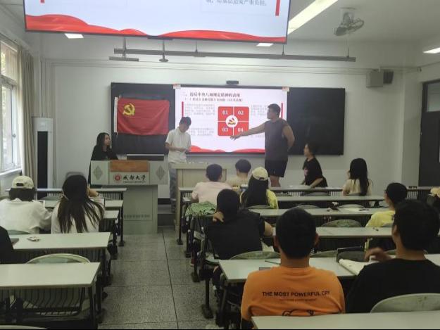 随后,主持人对违反中央八项规定精神的表现进行了详细讲述,并让两名学生党员上台生动形象地演绎了应该怎样避免违反中央八项规定精神。