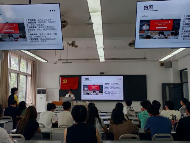 培训首先围绕新闻写作核心要点展开。在摄影环节,周小楠强调拍照需主题明确,以“某人正在做某事”为准则;构图宜采用对称法,确保画面平衡协调并突出主体;需保证照片清晰锐利,避免模糊、抖动,且留白适度;要素方面,演讲人、观众、主题内容、党旗缺一不可;通过多拍多筛选,捕捉人物正常表情的瞬间,同时要求横屏拍摄。此外,周小楠在讲解的过程中还采用提问的形式,增强了各位同学的专注力。