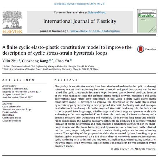 最新科研成果“A finite cyclic elasto-plastic constitutive model to improve the description of cyclic stress-strain hysteresis loops”。