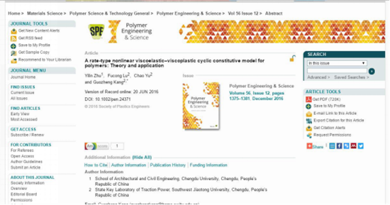 (三)在《Polymer Engineering & Science》上发表A rate-type nonlinear viscoelastic-viscoplastic cyclic constitutive model for polymers: Theory and application