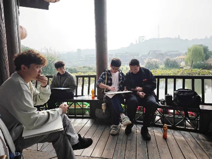 李庄古镇素有“万里长江第一古镇”之称,距今已有1400余年历史,古镇以青砖黛瓦的穿斗式木结构民居为主,院落错落有致,街道尺度宜人。保存完好的明清建筑群、独特的川南民居风格以及抗战时期的文化积淀,使其成为建筑学美术写生的活态教材。实习首日,师生们参观了李庄古镇的核心保护区,重点考察了旋螺殿、奎星阁、张家祠、营造学社纪念馆等标志性建筑,初步确定了此次实习写生的创作场景。在为期3天的实习实践中,杨艺老师现场讲解了李庄建筑的空间布局、木构技艺与装饰细节,学生们通过测绘、摄影与速写,记录下建筑的形制特点,并围绕建筑表现技法等主题展开小组讨论。师生们以李庄的街巷、院落、码头为课堂,开展了多主题的美术写生,在江边、巷口拿起画本,用马克笔、钢笔等绘图工具为媒介捕捉建筑的韵律感,部分作品还融入了对当地居民生活场景的描绘,展现出建筑与人文的共生关系。