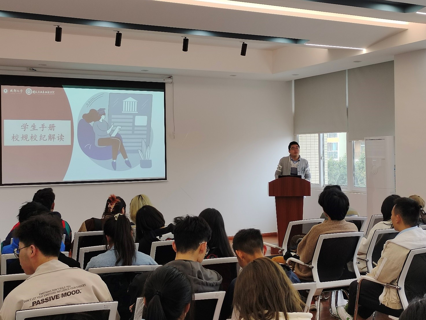 讲解校规校纪的内容时,强调了守纪律、遵守规矩的重要性,并对违反校规的处罚进行了详细讲解,列举了学院以往的违纪案例,希望以此来警示同学们。同时,也期望同学们能够不断提高自己的标准,下更大的功夫要求自己,成为新时代有责任、有担当的大学生。