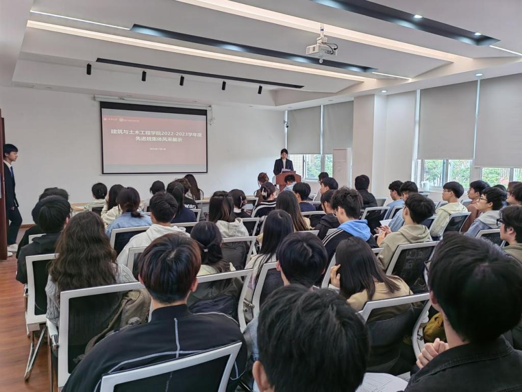 先进班集体风采展示活动在建工楼三楼学术报告厅举行。活动由团学组织张尧同学主持。本次评选活动共有12个班集体参与评选,特邀系室主任、班主任代表与学工办老师担任专家评审,23级学生代表担任大众评审。
