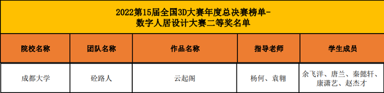 12月9日,“砼路人”团队凭借作品《云起阁》在2022第15届3D大赛年度总决赛--数字人居设计大赛中获全国二等奖!