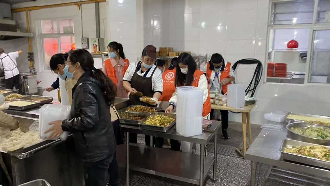 当天中午,数十名志愿者在一食堂集合后,前往后厨进行一系列的志愿活动。在相关负责人的安排下,我们志愿者被分为了三批:帮助食堂阿姨打饭,协助食堂阿姨装菜,为每一个餐盒盖上盖子。