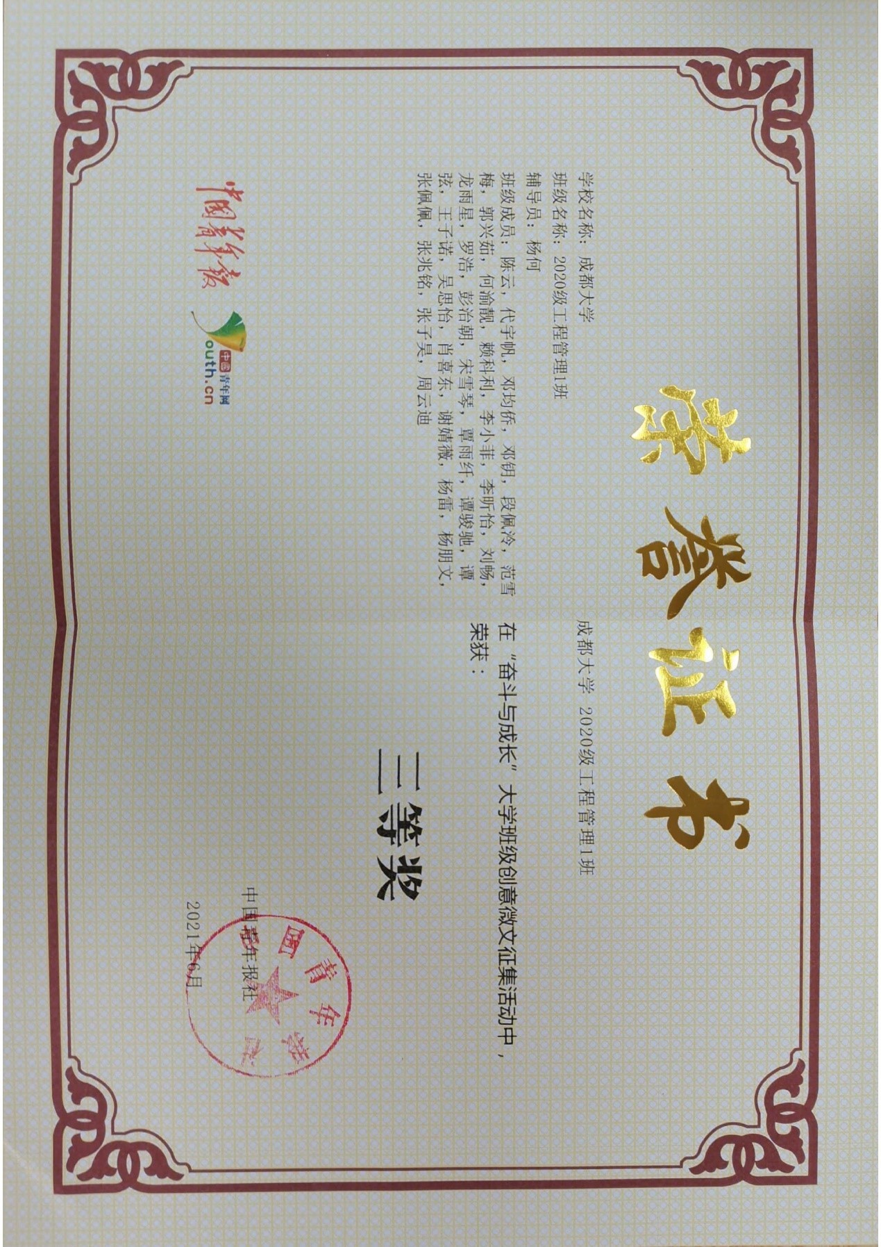 2020级工程管理一班在本次活动中荣获三等奖,杨何老师荣获优秀辅导员,何渝靓同学荣获优秀班干部。
