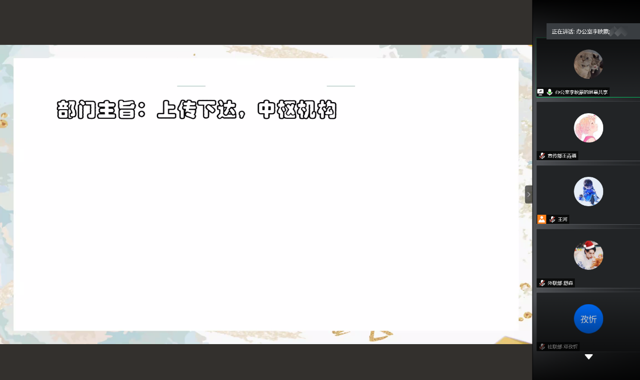 下午3时,在王河的组织下,两委会成员有序地进入了腾讯会议,准备听取本次线上会议。会议开始,首先杨雅鑫副书记总结了成人视频