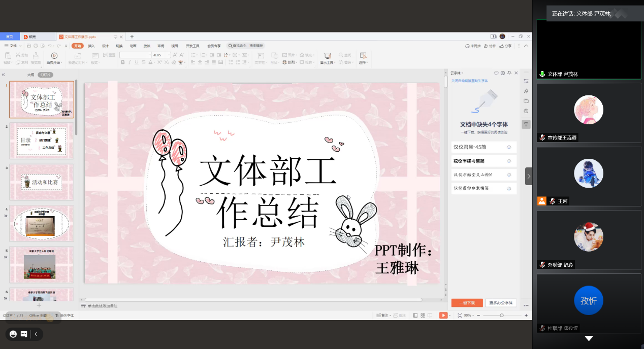 杨副书记总结结束后,组织部负责人张多、团校负责人付楠洁、志工部负责人史宗泽、宣传部负责人何志文、办公室负责人李映蒙、文体部负责人尹茂林、生活心理部负责人徐成、学研部负责人胡艾、外联部负责人蒋旭、科创部负责人侯雅婕、就业部负责人秦红殷、社联负责人曹哲宇依次从各个方面总结了所属部门2020年度的工作,反思了过去工作中的失误和不足,展望了2021年度的美好未来。同时,也展现了成人视频
