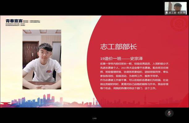 大会第三项,部长竞选,共41位候选人进行竞选,竞选内容分为自我介绍、自身优势、工作规划等。团校部长候选人付楠洁在介绍中说:“我是来自团校的一个活泼开朗,精力充沛的女生,妥妥的摩羯工作狂,对部门工作与学习生活都充满热情,并在短暂的大一时光积累了较为丰富的工作经验,也在2019~2020获学院两委会获“优秀干事”。喜欢并热爱学校或学院部门活动,善于处理人际关系,与周围人张弛有度相处,性格随和大方,待人谦逊,有着较强的组织能力和领导能力,对待工作认真负责。 爱好钢琴,徒步,滑滑板,同时热爱旅行,对于工作或者是学习坚守着今日事今日毕的原则,热衷于参加学校或是学院活动,积极性强。”候选人都已饱满的热情表达自己想要任职的心愿,希望能为两委会做出更好的贡献。
