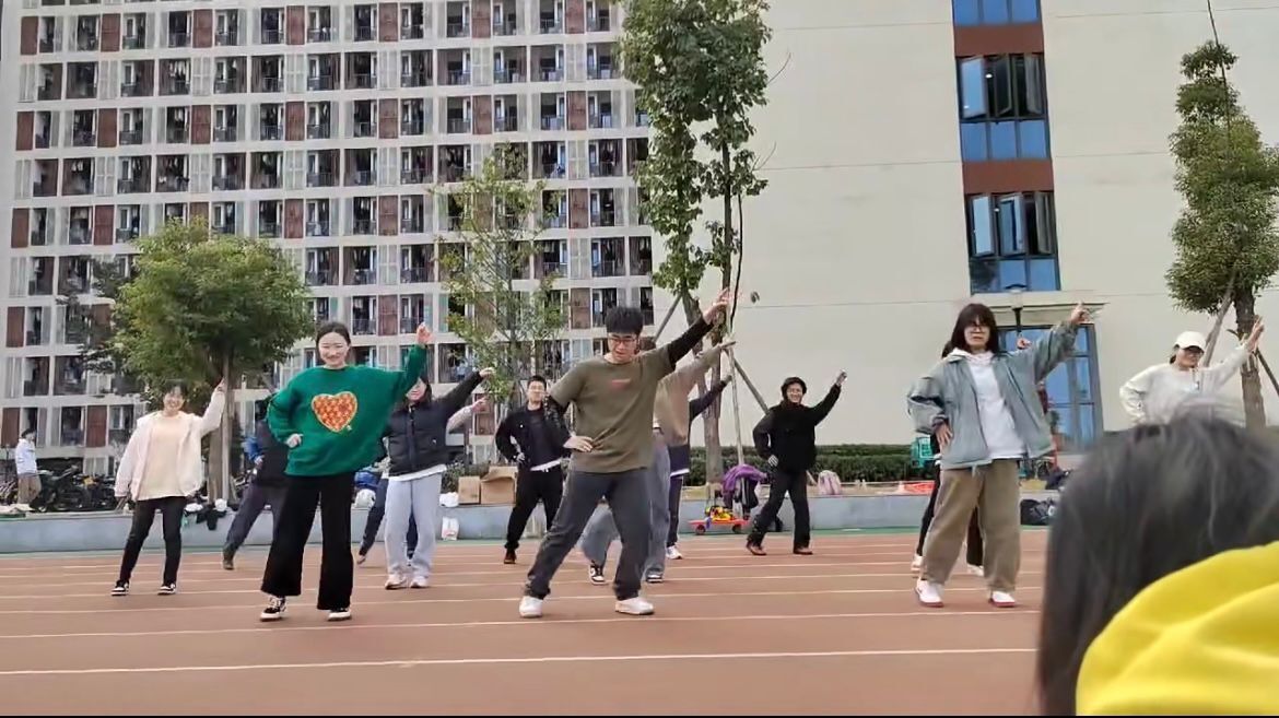 在同学们欢快的笑声中,本次活动迎来了万众期待的一个环节——“土味情歌唱跳”。在20分钟排练时间中,同学们跟随着音乐积极学习舞蹈,在操场上展现着灵动的舞姿,最终将成果完美地展现在同学们眼前。