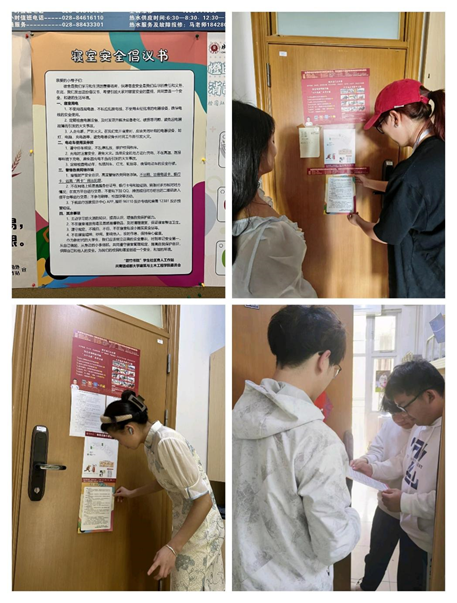 “箭竹书院”学生社区育人工作站学生工作人员、团学组织生活心理部同学采用多种方式进行寝室安全宣传。一是设立宣传地点进行宣传,分别于一、二、四、五栋宿舍设立了宣传地点,通过在不同宿舍楼设置宣传地点,让更多的同学能够方便地了解和参与到宣传活动中,增强了活动的覆盖面和影响力。二是利用海报进行宣传,分别于一、二、三、四、五栋宿舍一楼大厅公告栏处张贴“寝室安全倡议书”海报,海报内容包括宿舍用电、电动车使用及停放、防诈骗、遵守寝室规章制度等内容,呼吁同学们重视寝室安全,共创安全、和谐环境,海报图文并茂的方式吸引了众多同学的关注。三是结合“绿色周二”寝室大清洁检查,深入学院各个寝室通过传单、口头讲解等方式向同学们进行寝室安全宣传,进一步加强了同学们的安全意识和防范能力。
