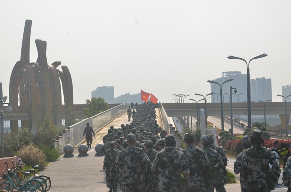 在历时两个小时的拉练中,同学们听从教官的指挥,互相鼓励帮助。努力克服拉练过程中出现的种种问题,最终完成了各项任务。