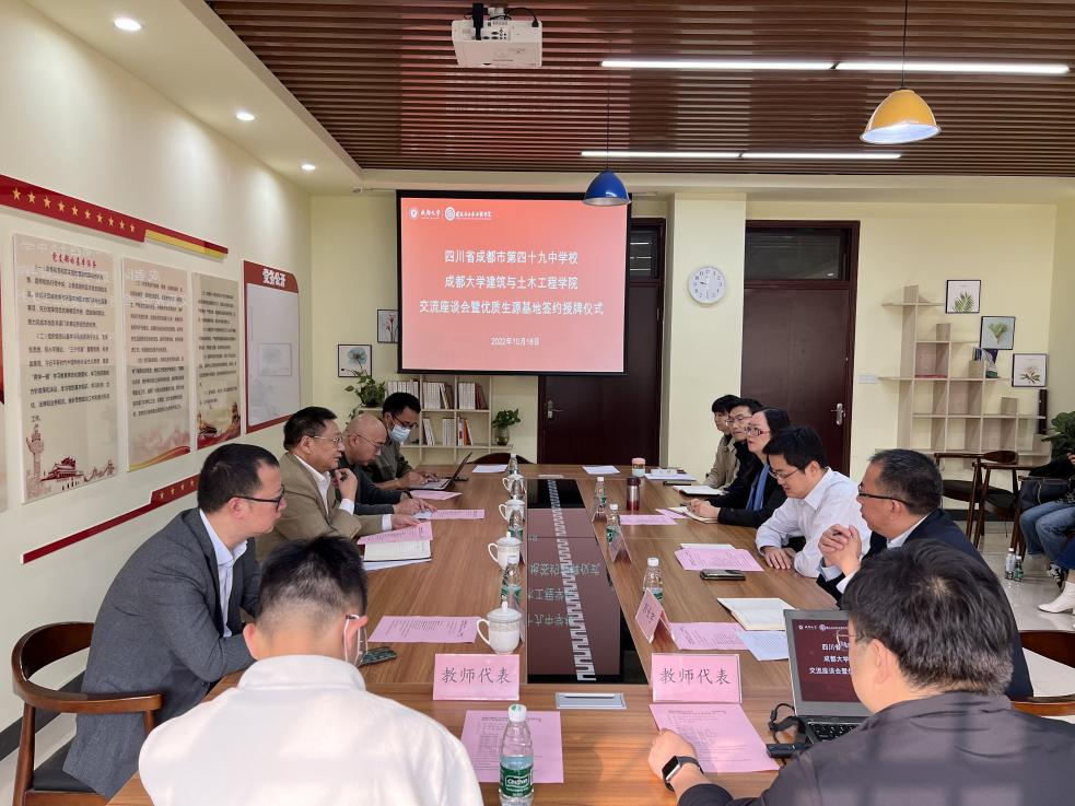 “优质生源基地”签约授牌仪式暨交流座谈会在建工楼S3212举行,出席本次会议的有:教务处副处长彭长宇、学院院长吴启红、副院长王静、成都市第四十九中学校长涂学刚、副校长任小林、教务处主任何陈宁一行,以及成人视频