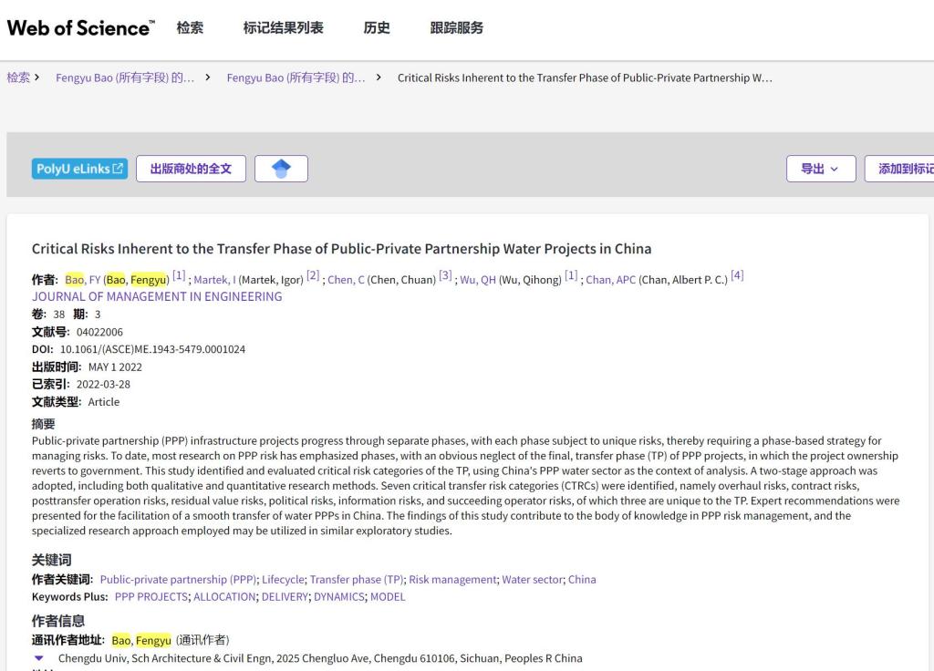 为第一单位在工程管理领域国际顶级期刊《Journal of Management in Engineering》(中科院一区,IF=6.853)上发表了题为“Critical Risks Inherent to the Transfer Phase of Public-Private Partnership Water Projects in China”的最新研究成果。