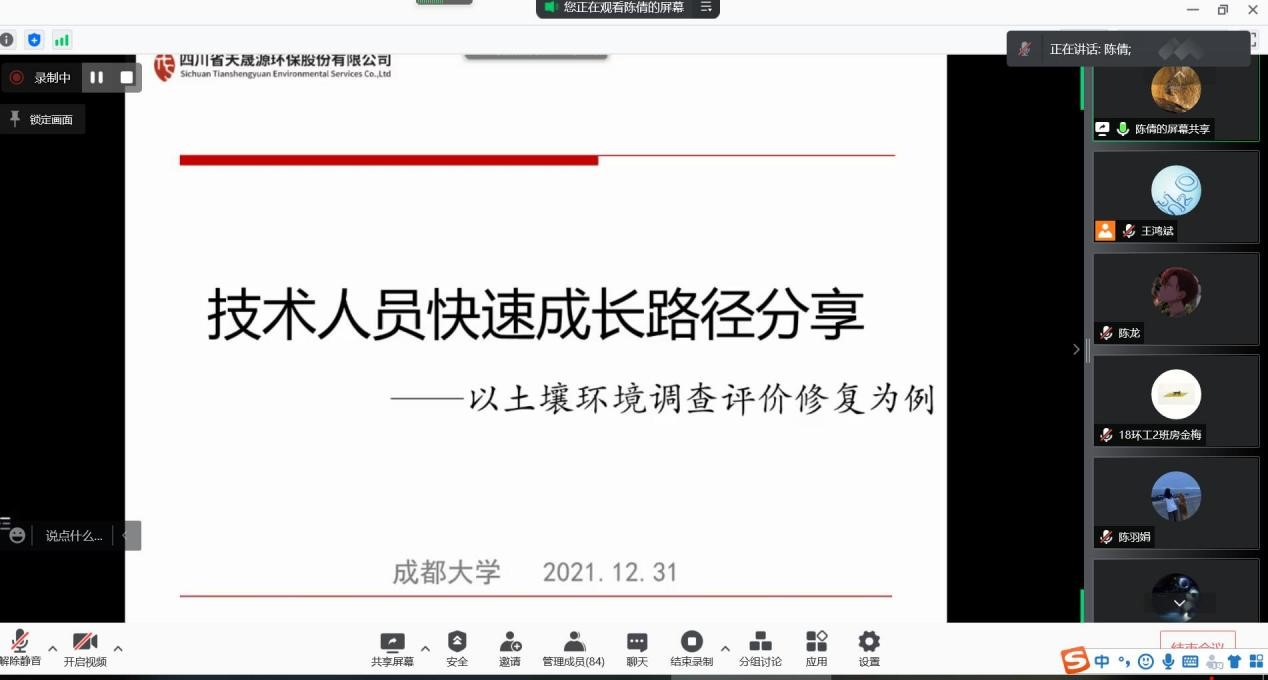 本次讲座邀请了四川省天晟源环保股份有限公司总工程师陈倩教授及高工,以腾讯视频会议形式开展,讲座主题为《技术人员快速成长路径分享-以土壤环境调查评估修复为例》。会议由环工系组织,学院副院长董建辉主持,各年级优秀学生参加。