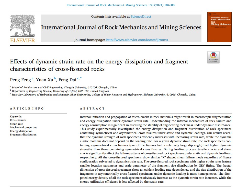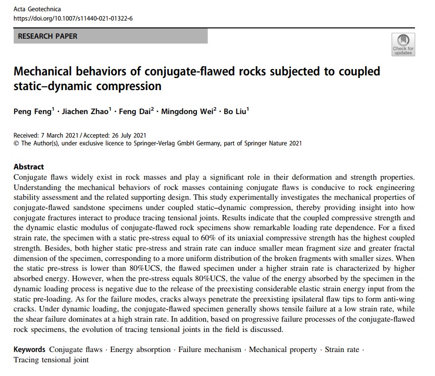为第一单位在国际期刊Acta Geotechnica和International Journal of Rock Mechanics and Mining Sciences发表两篇研究成果。“Mechanical behaviors of conjugate-flawed rocks subjected to coupled static–dynamic compression”(中科院SCI一区,IF=5.856)和“Effects of dynamic strain rate on the energy dissipation and fragment characteristics of cross-fissured rocks”(中科院SCI二区,IF=7.315)。
