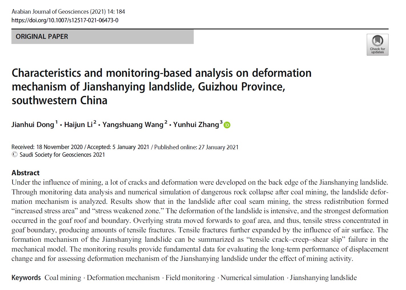 第一单位在地质岩土工程领域著名期刊《ARABIAN JOURNAL OF GEOSCIENCES》(中科院四区期刊,影响因子1.827)上发表了一篇题为“Characteristics and Monitoring-Based Analysis on deformation mechanism of Jianshanying landslide, Guizhou Province, southwestern China”的最新研究成果。
