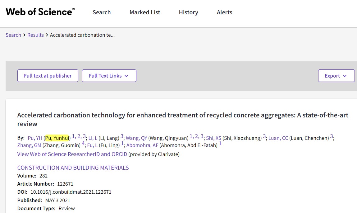 第一单位在工程领域国际期刊Construction and building materials(SCI, 中科院一区,IF=6.141)上发表题为“Accelerated carbonation technology for enhanced treatment of recycled concrete aggregates:A state-of-the-art review”的研究成果。