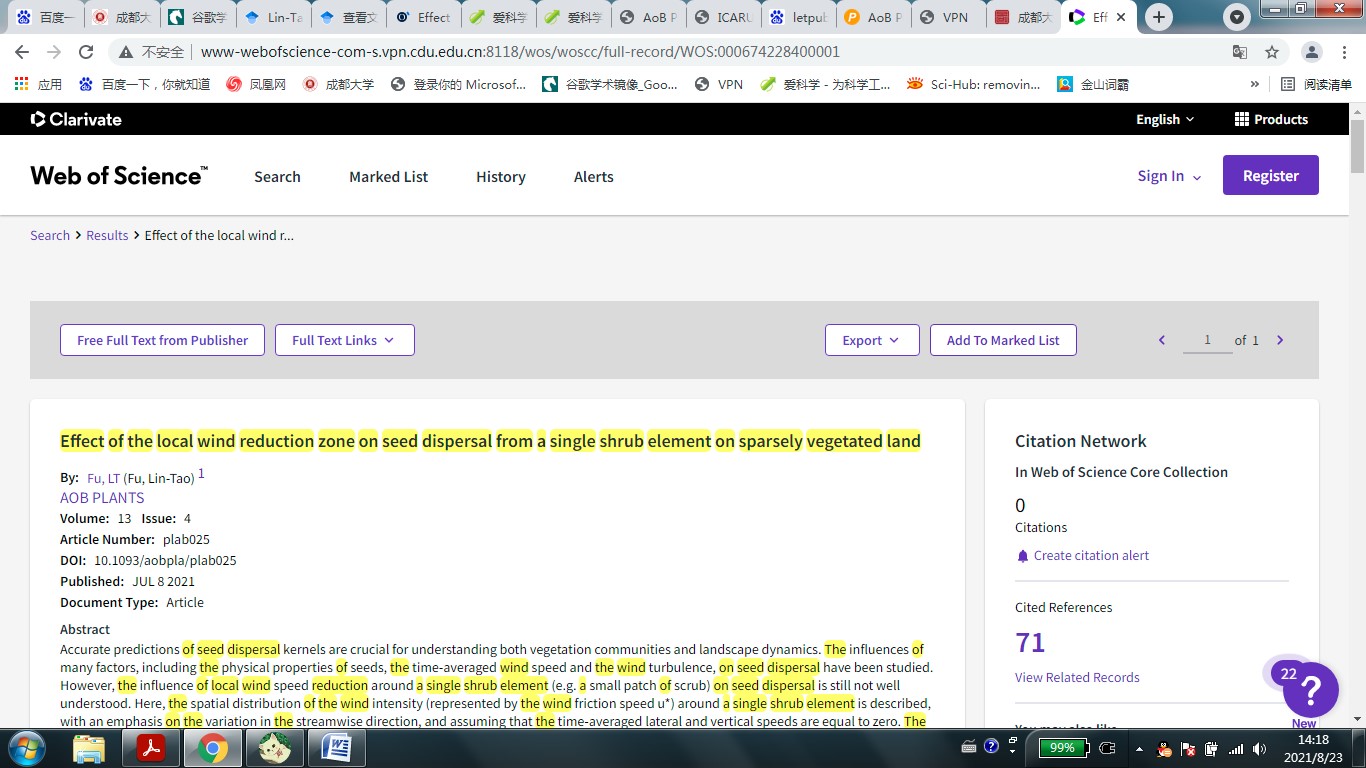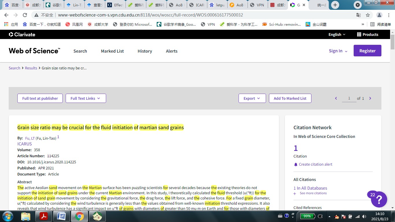 为第一单位在国际期刊Icarus和AoB Plants发表两篇研究成果。“Grain size ratio may be crucial for the fluid initiation of martian sand grains”(中科院SCI二区, 影响因子3.508I)和“Effect of the Local Wind Reduction Zone on Seed Dispersal from a Single Shrub Element on Sparsely Vegetated Land”(中科院SCI三区, 影响因子3.276)。