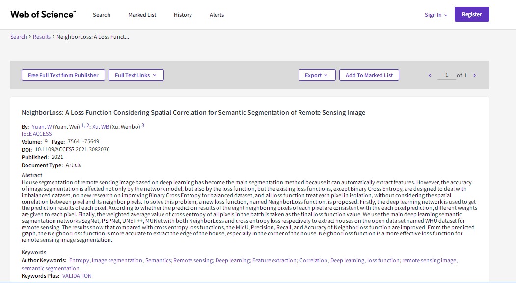为第一单位在SCI二区期刊IEEE access上发表题为“NeighborLoss: A Loss Function Considering Spatial Correlation for Semantic Segmentation of Remote Sensing Image”的学术论文。