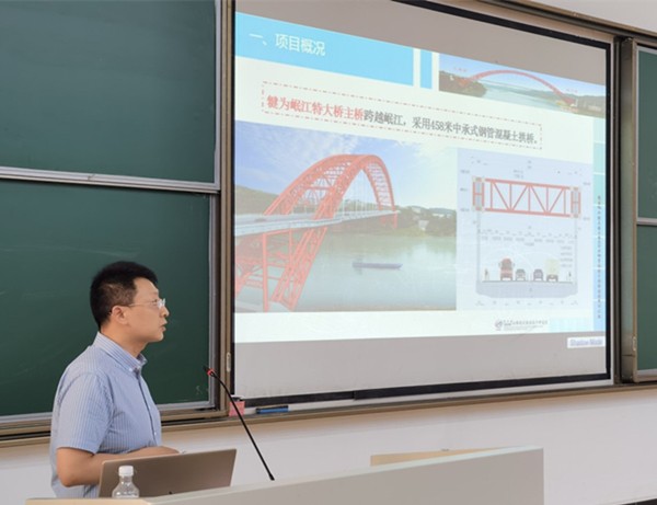 何畅教高长期从事大跨度复杂桥梁设计,主持或参与设计的桥梁获优质国家优质工程奖两项, 国家级优秀设计一等奖三项,省级优秀设计一等奖五项。在课堂上,何畅教高以“交通部示范工程-G4216仁沐高速公路犍为岷江特大桥”为例,升入浅出的向同学们展现了大跨度钢管混凝土拱桥从方案构思、前期设计直至施工完成的全过程及其关键创新技术。 犍为岷江特大桥为主跨458米中承式钢管混凝土拱桥,主梁采用钢板梁,具有桥梁跨度大、结构复杂、环保要求高等特点,通过两节课的讲解,同学们对复杂大跨度桥梁设计施工流程,对我国我省先进桥梁设计建造技术水平有了直观的了解,专业兴趣和热情得到了极大激发,理论结合实践的能力得到提升,纷纷表示获益匪浅。