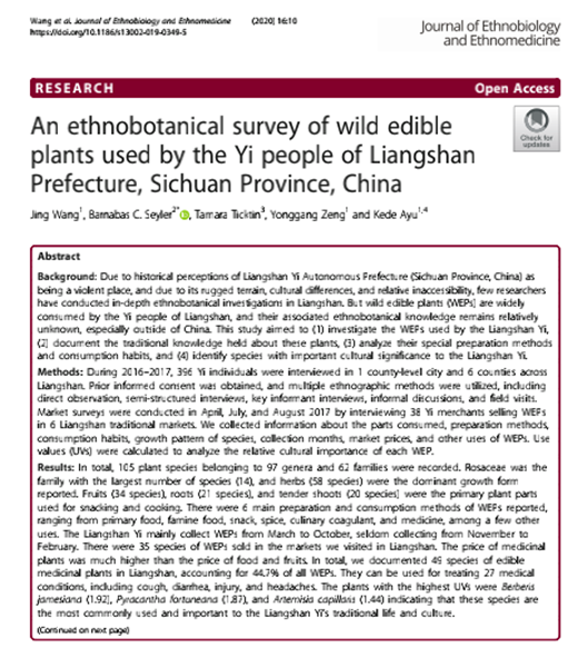 第一单位在在医学领域国际期刊《Journal of Ethnobiology and Ethnomedicine》(中科院四区,IF=2.264)上发表了题为“An ethnobotanical survey of wild edible plants used by the Yi people of Liangshan Prefecture, Sichuan Province, China。”的最新研究成果。该文章是王静博士主持的自然科学基金青年基金项目“凉山地区彝族传统野生食用植物资源的民族植物学研究”(31600253)成果之一。